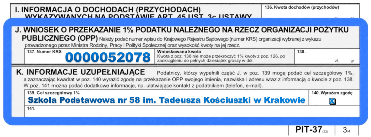 Wszystkim darczyńcom serdecznie dziękujemy oraz ponownie zachęcamy do przekazania 1,5% podatku na rzecz Szkoły Podstawowej nr 58 im. Tadeusza Kościuszki w Krakowie!